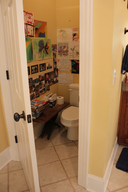 I have a potty closet. No, really (yes some of you have witnessed it) in my bathroom there is a door that looks like it should go to a closet of some sort and when you open it there is nothing but a toilet in it. It is one of my favorite places in my house, mostly because to get to it there are three doors with locks that separate it (and therefore me) from the rest of the world (and sometimes certain children). It may be an odd thing, but i have decided to make it my little collage room/reading library. Don't get all judgey on me, you know some of the best reading is done in the bathroom! ;-) I have a little table in there with some choice books and all the photos on the wall that i couldn't possibly afford frames for, but love. Do not fret, there is a strict "no flushing unless the toilet seat in down" rule for my potty closet and seen as there are three other bathrooms in this house i usually don't have to worry about kids coming in and using it anyway.